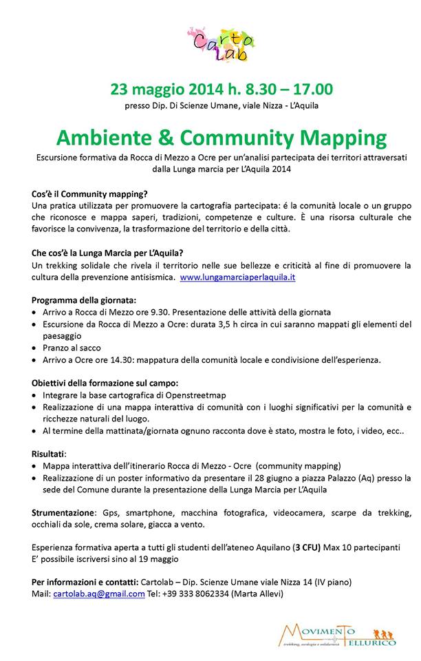 Dopo gli eventi urbani degli ultimi mesi, Movimento Tellurico sposta tutta la sua attenzione sulla Lunga Marcia per L’Aquila 2015. Sabato 16 maggio effettuerà un’escursione/sopralluogo per l’ultima tappa del percorso di questa edizione: