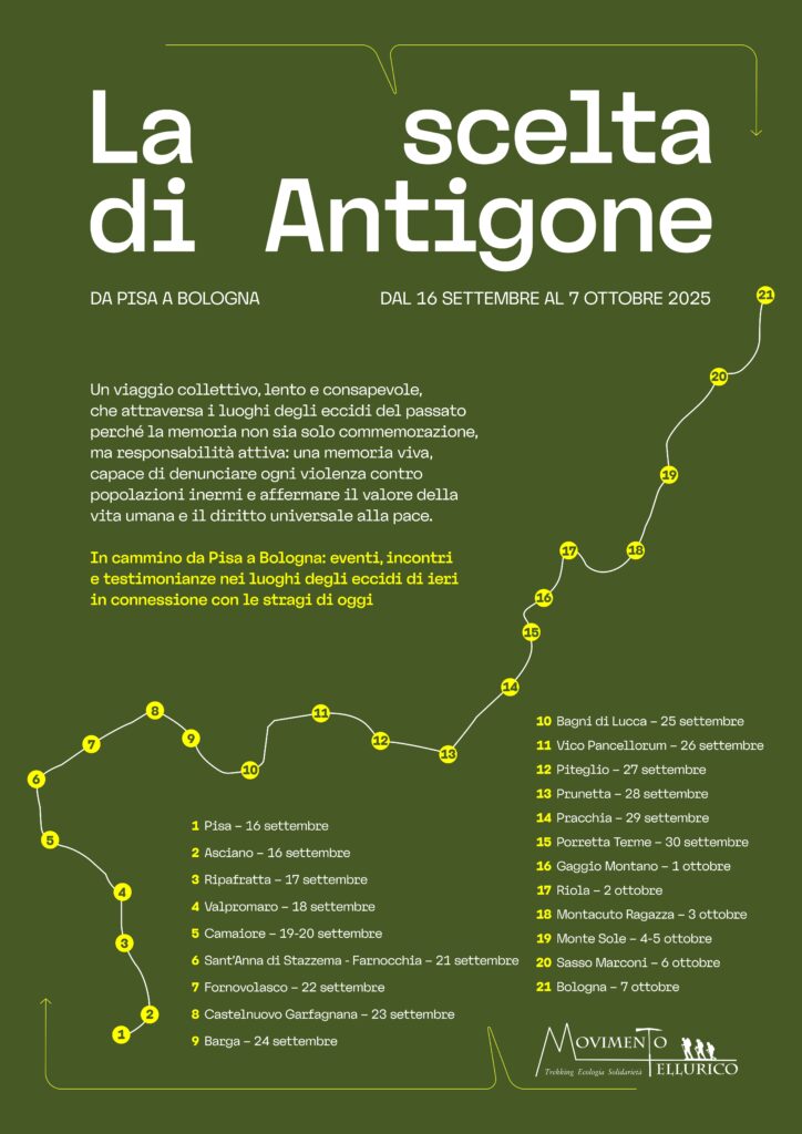 Dal 2021 l’Associazione Movimento Tellurico promuove un percorso escursionistico di forte valore simbolico e civile: il Cammino di Antigone, un cammino che partendo da Piazza dei Miracoli a Pisa raggiunga a piedi Bologna legando fra loro i luoghi che furono teatro della Resistenza e delle stragi nazifasciste compiute durante la terribile “estate di sangue del 1944”, fra le quali Sant’Anna di Stazzema e Monte Sole.